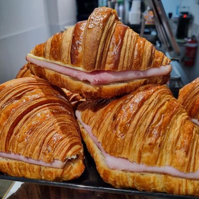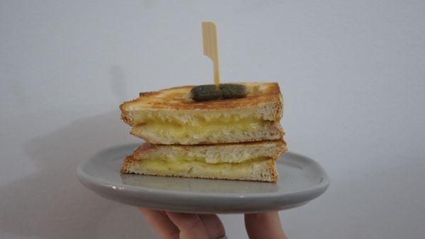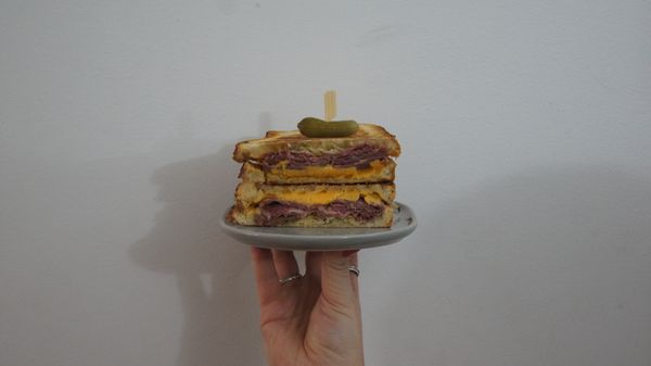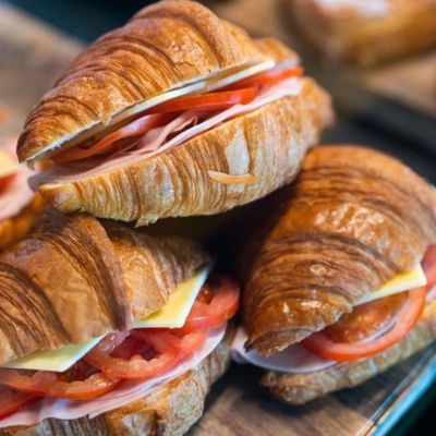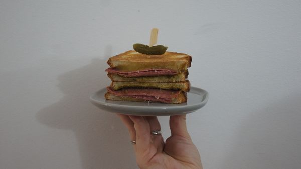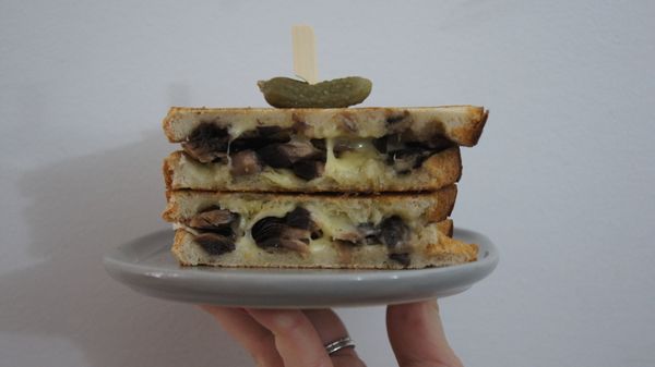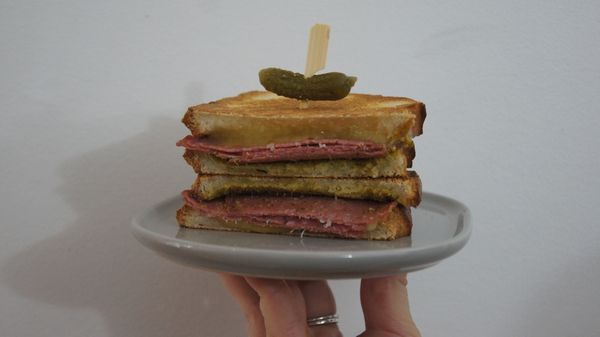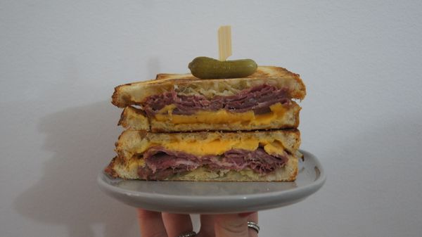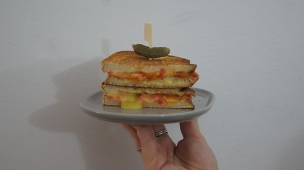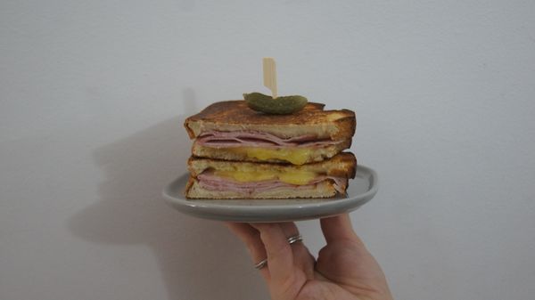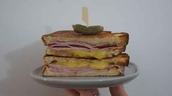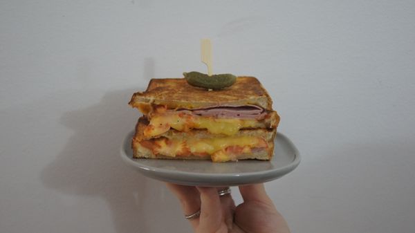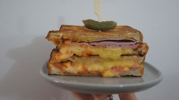 Ham, cheese, tomato, american mustard. Perfectly toasted.